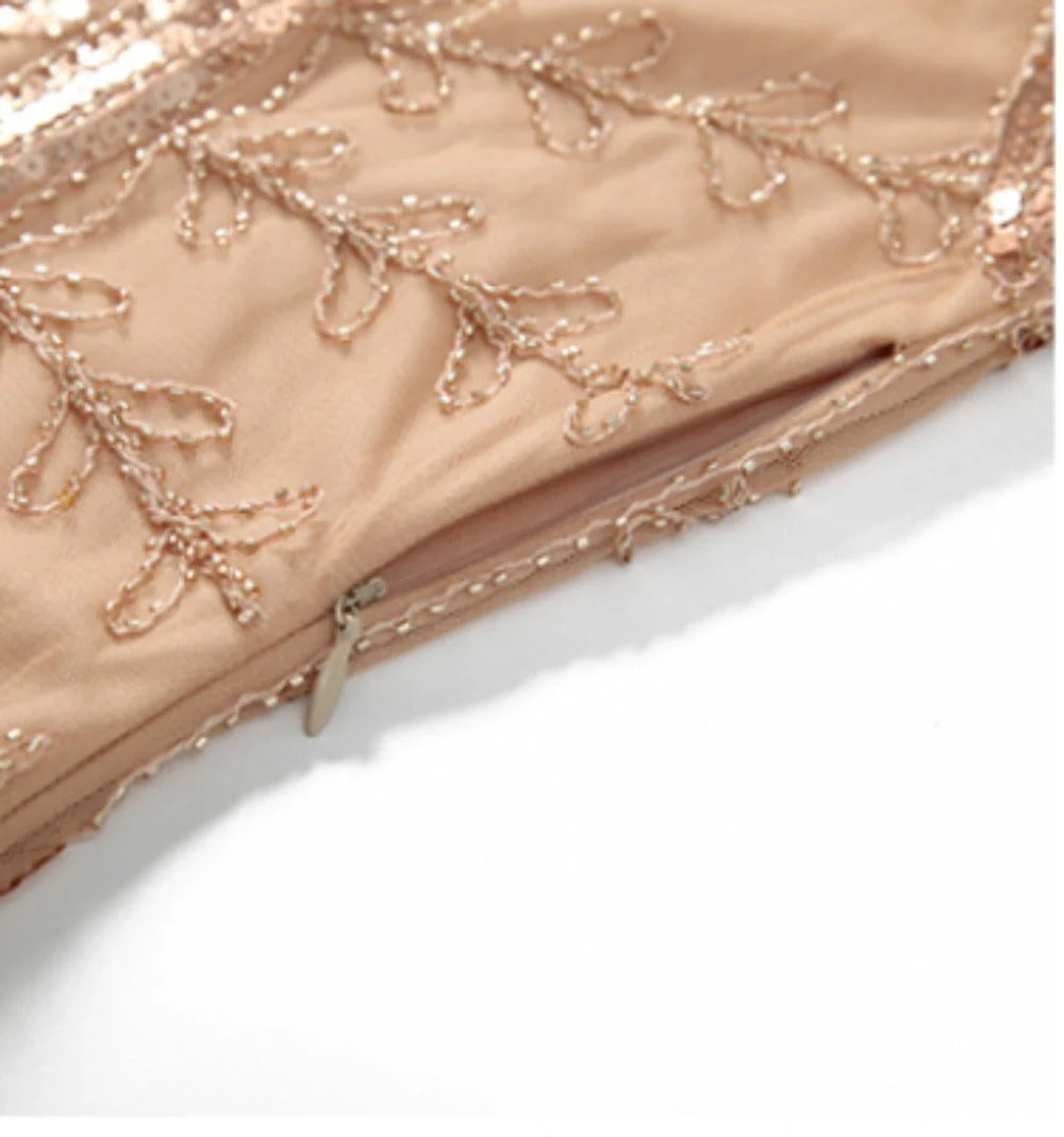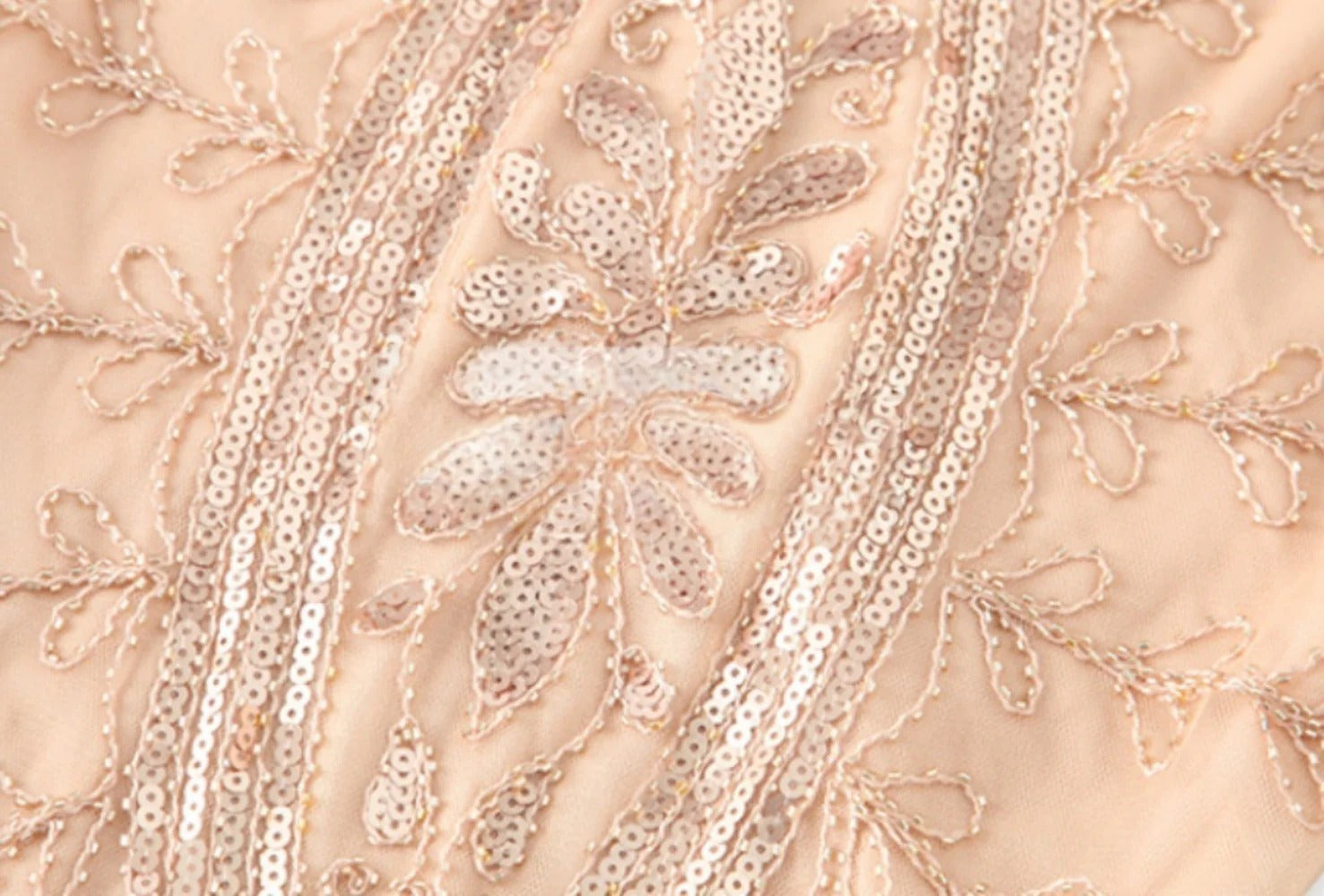 - Elegant champagne/apricot hue with sparkling gold-tone sequins