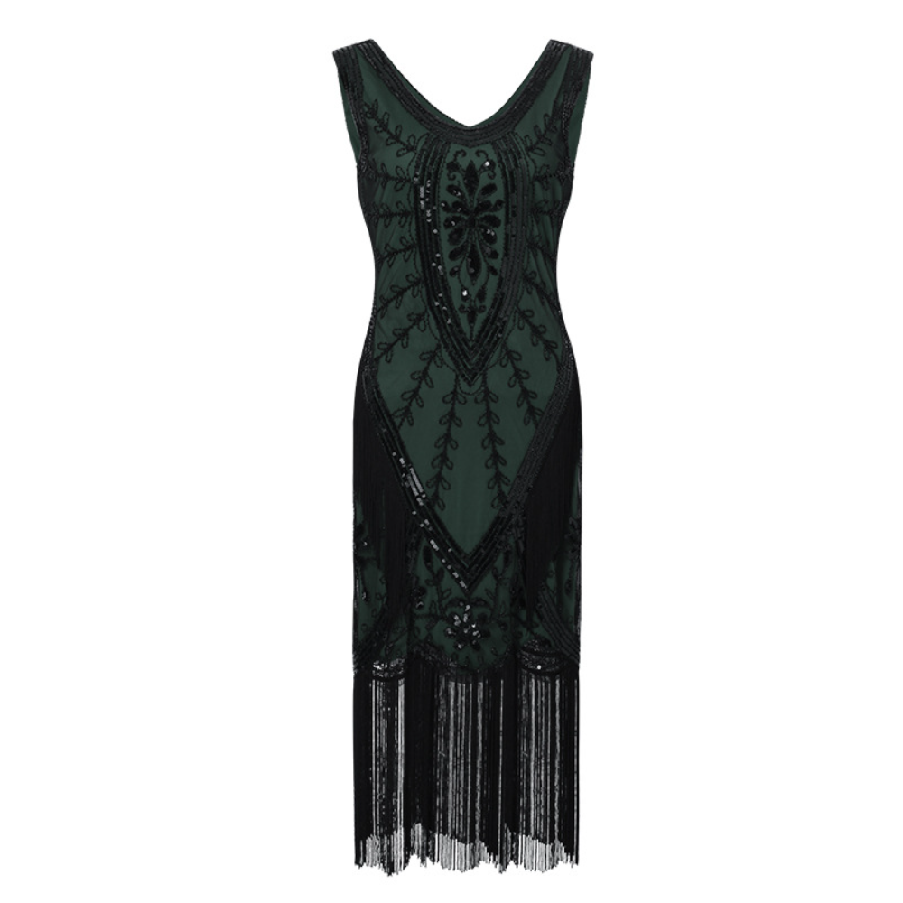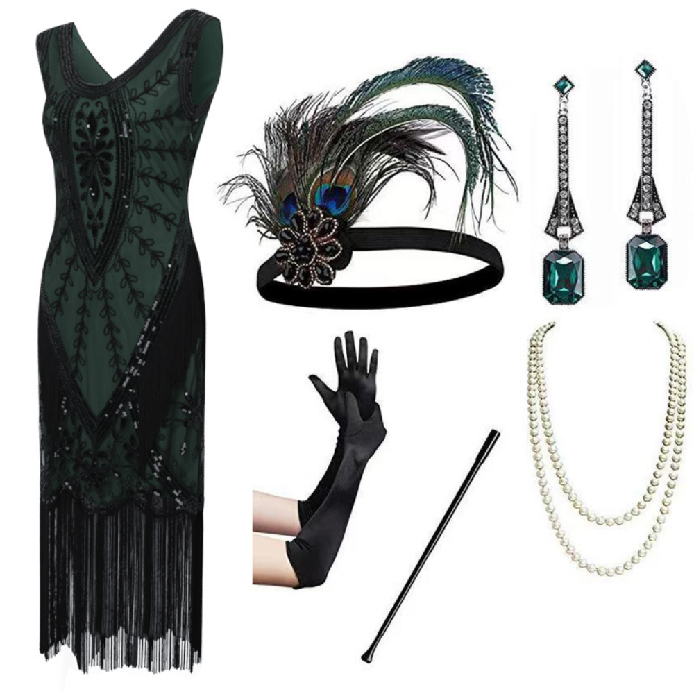 Vintage Black Green 1920s Gatsby Dress Women Sequin Flapper Costume Accessories Retro Outfit