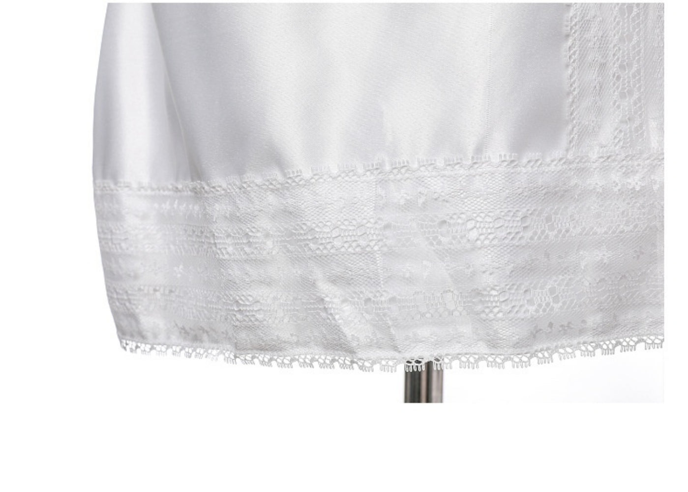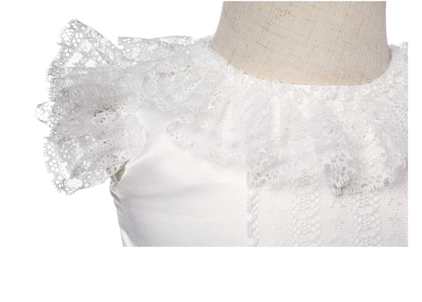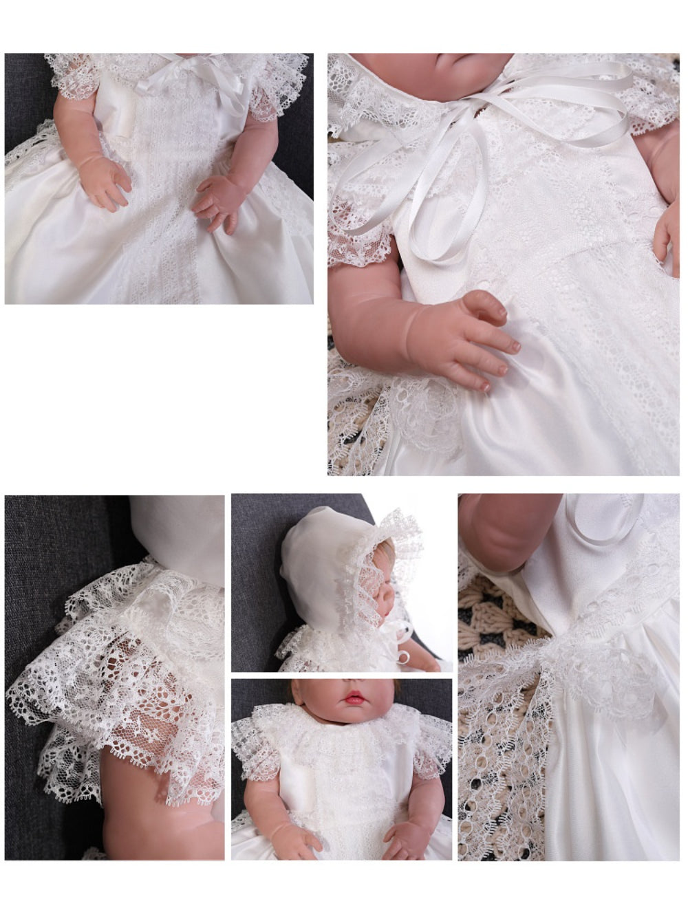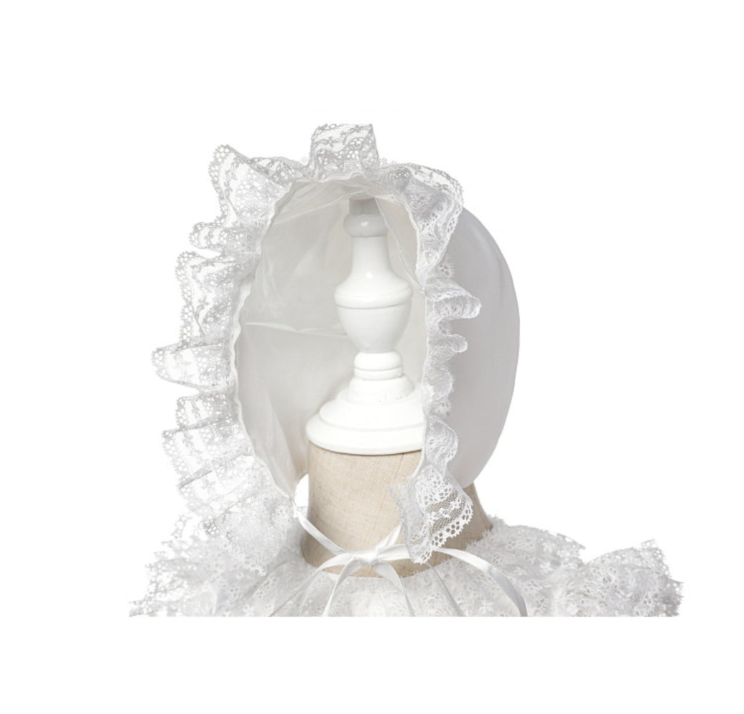 - Matching lace accents on sleeves, neckline, and bonnet for a cohesive look