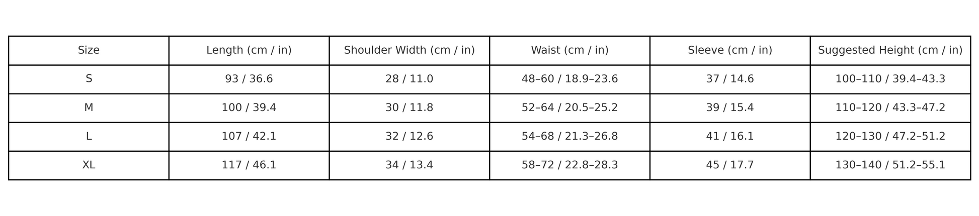 Manual measurement may vary by 1–2 cm (1 cm ≈ 0.39 in).