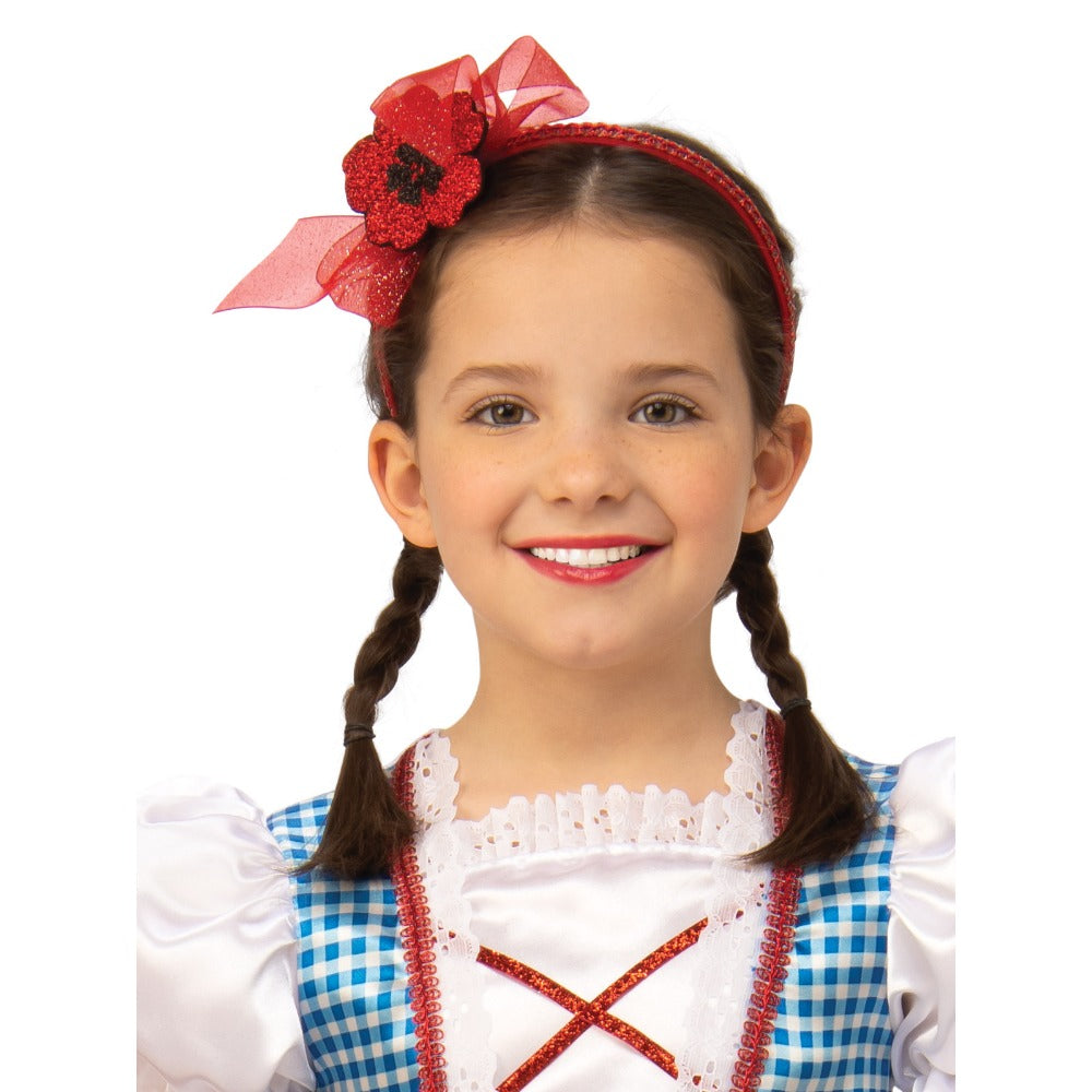 - 💫 Molded plastic headband with red braided trim, glittery bow & red flower accent
