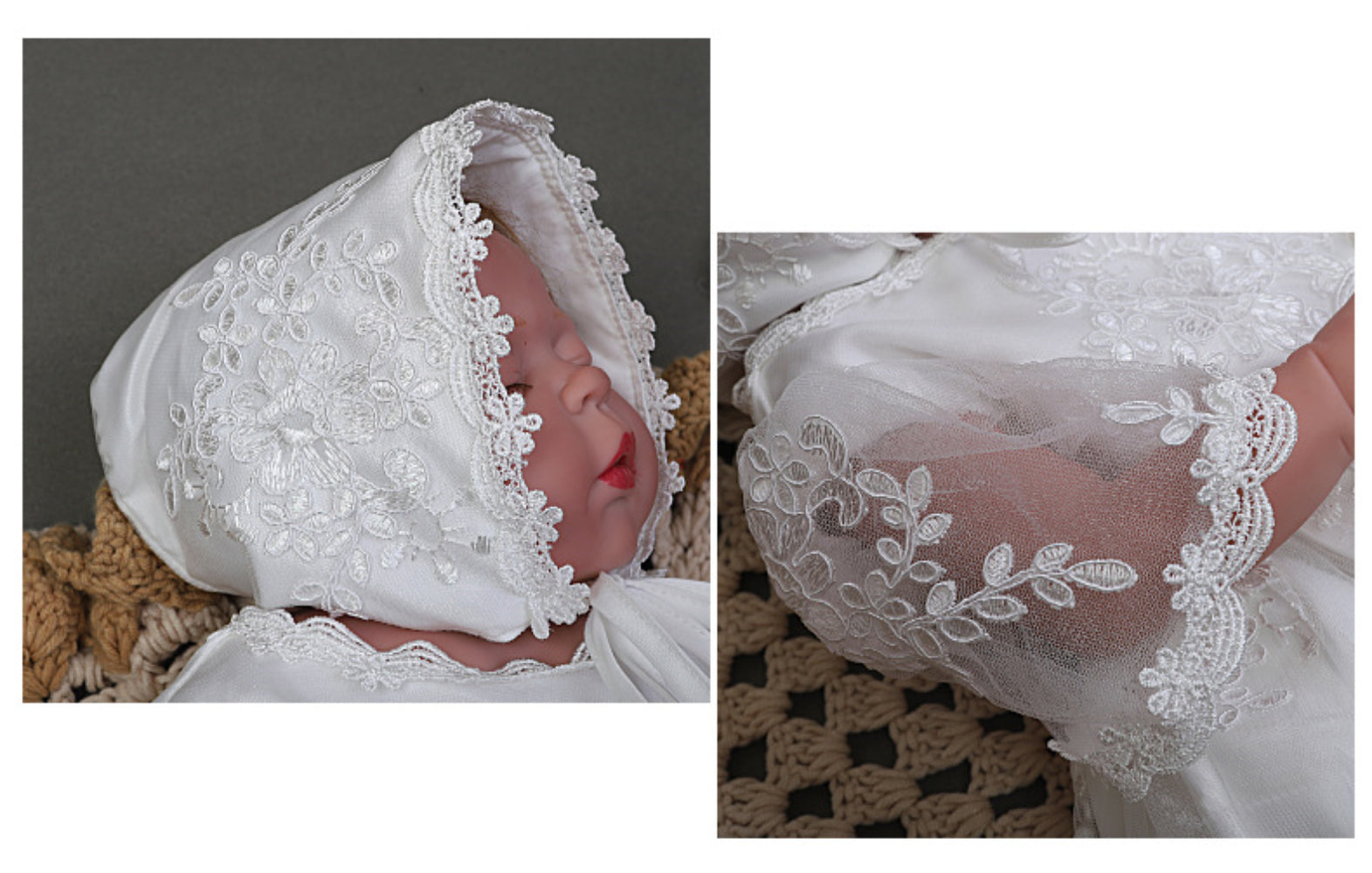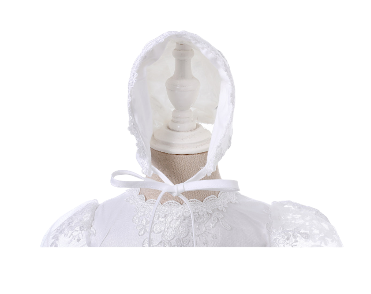 - Matching lace-trimmed bonnet included