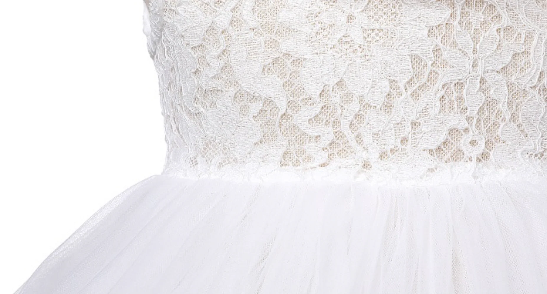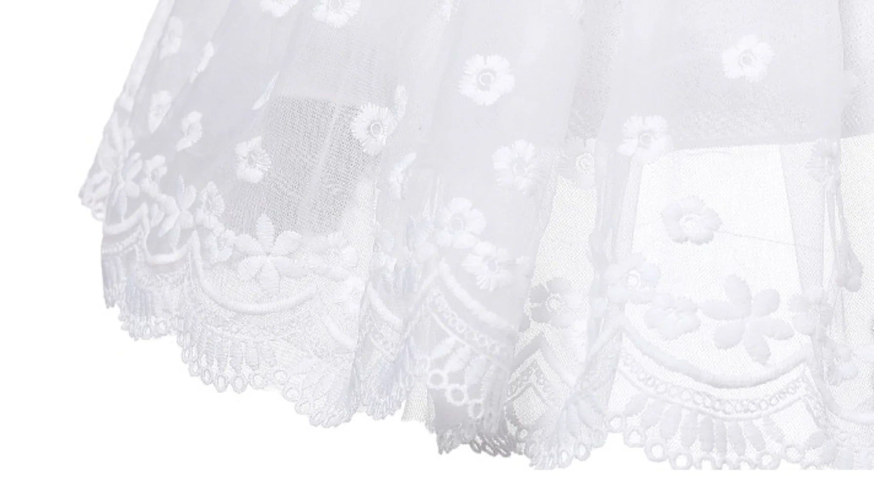 - 3-layer skirt: outer lace, middle tulle, soft cotton lining for comfort & structure