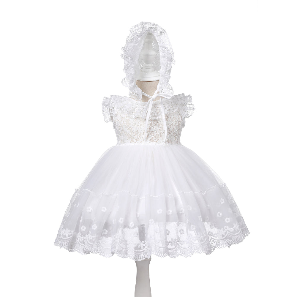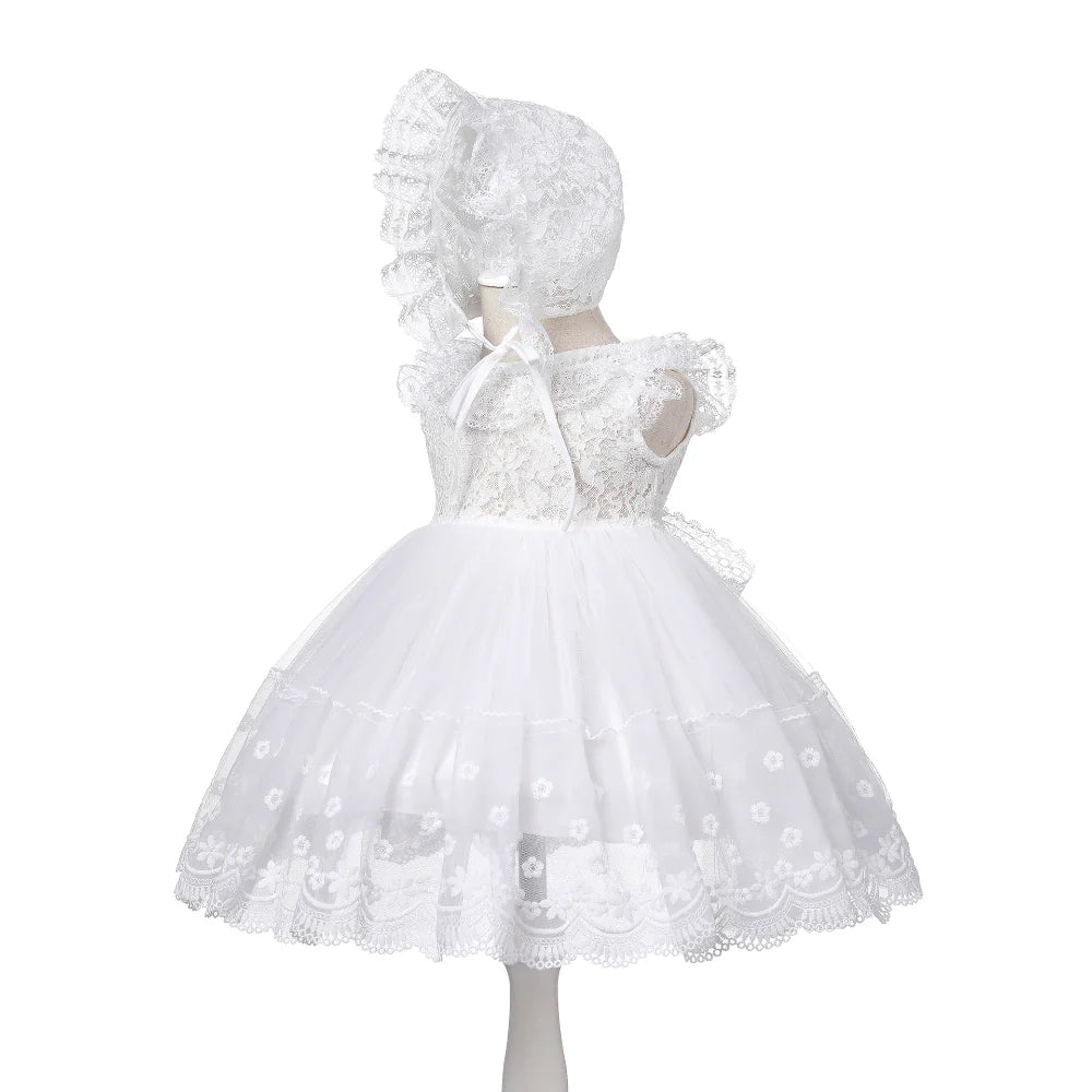 Baby Girl Lace Christening Dress with Hat – Sleeveless Princess Gown with Ruffle Collar
