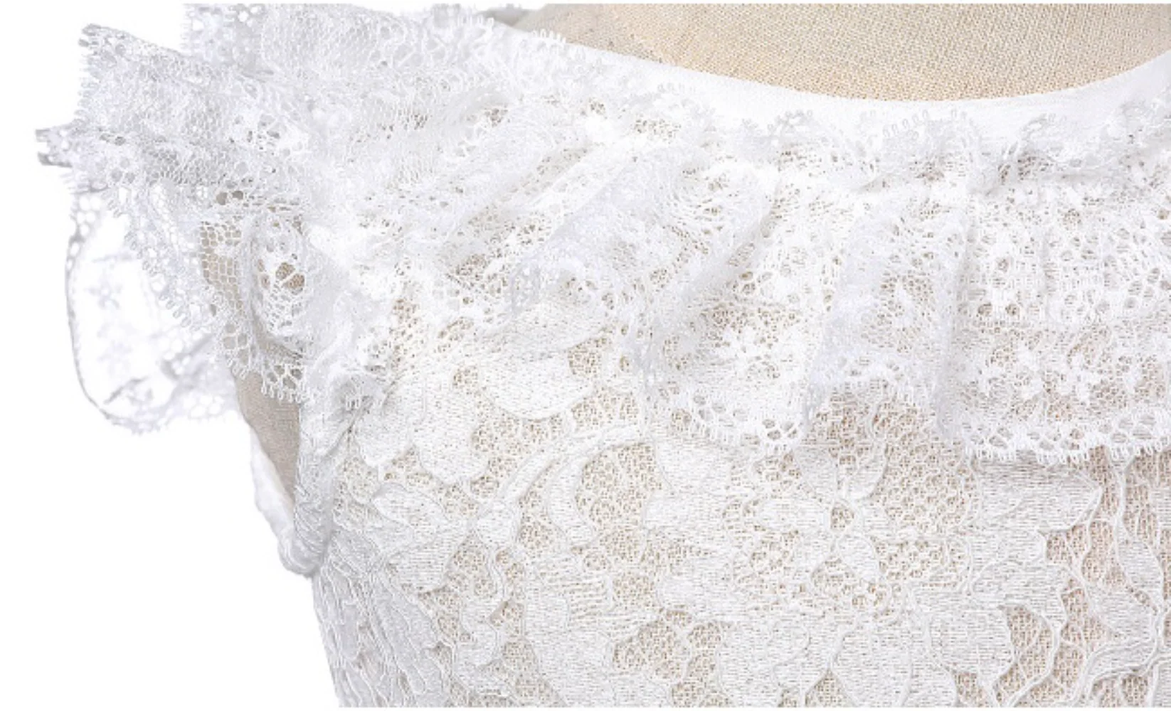 - Sleeveless with lace-trimmed flutter sleeves for a delicate touch