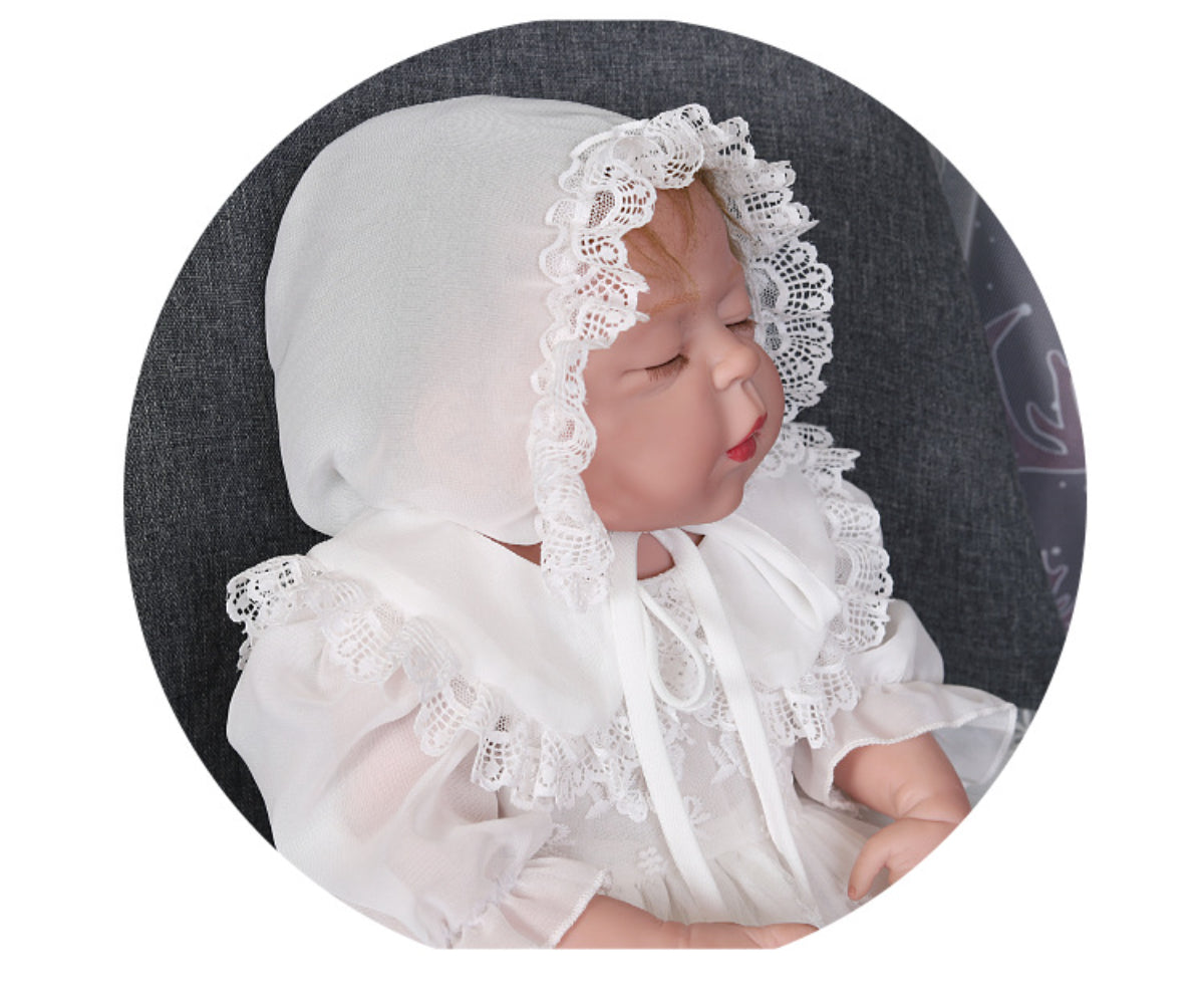 - Matching chiffon bonnet with lace-trimmed brim included