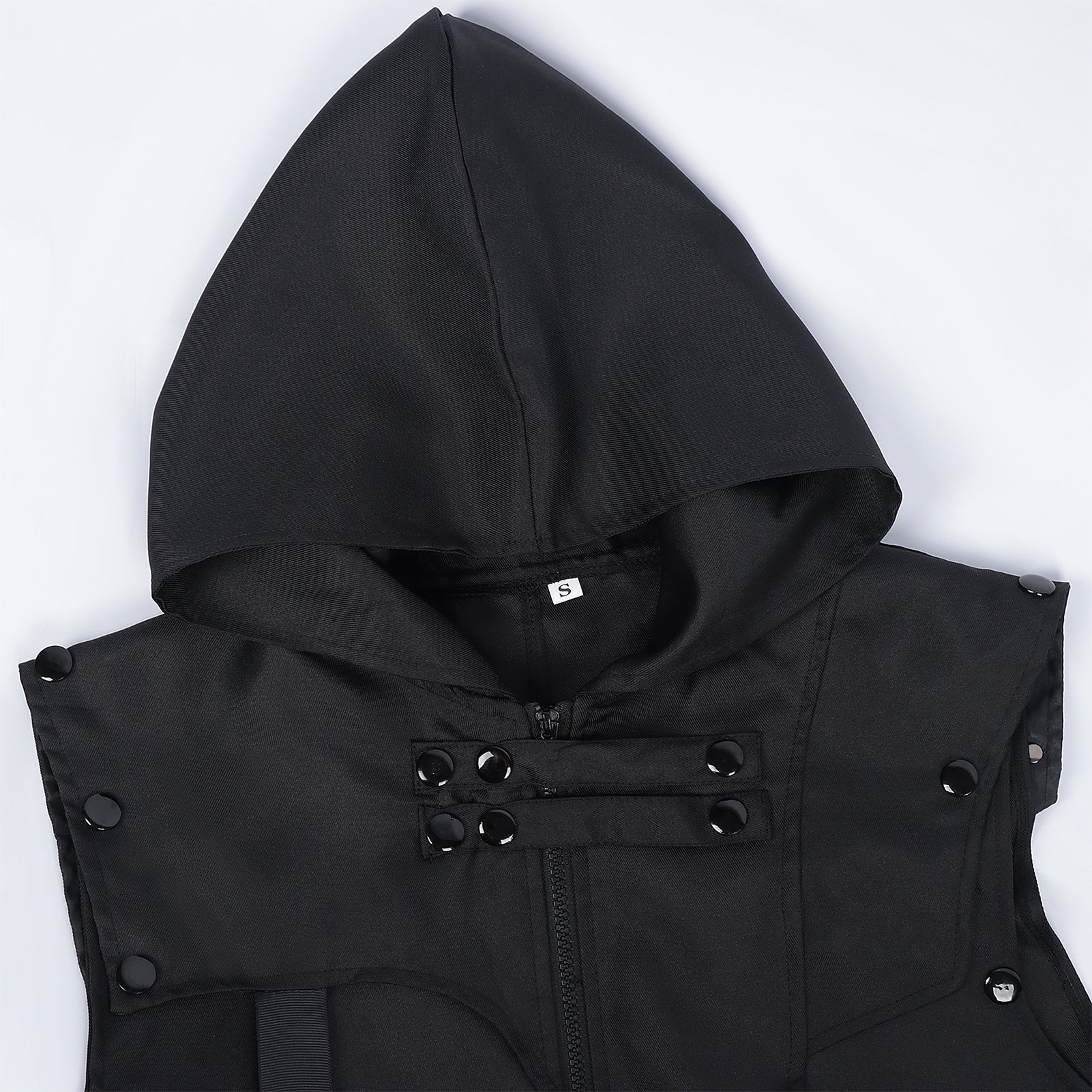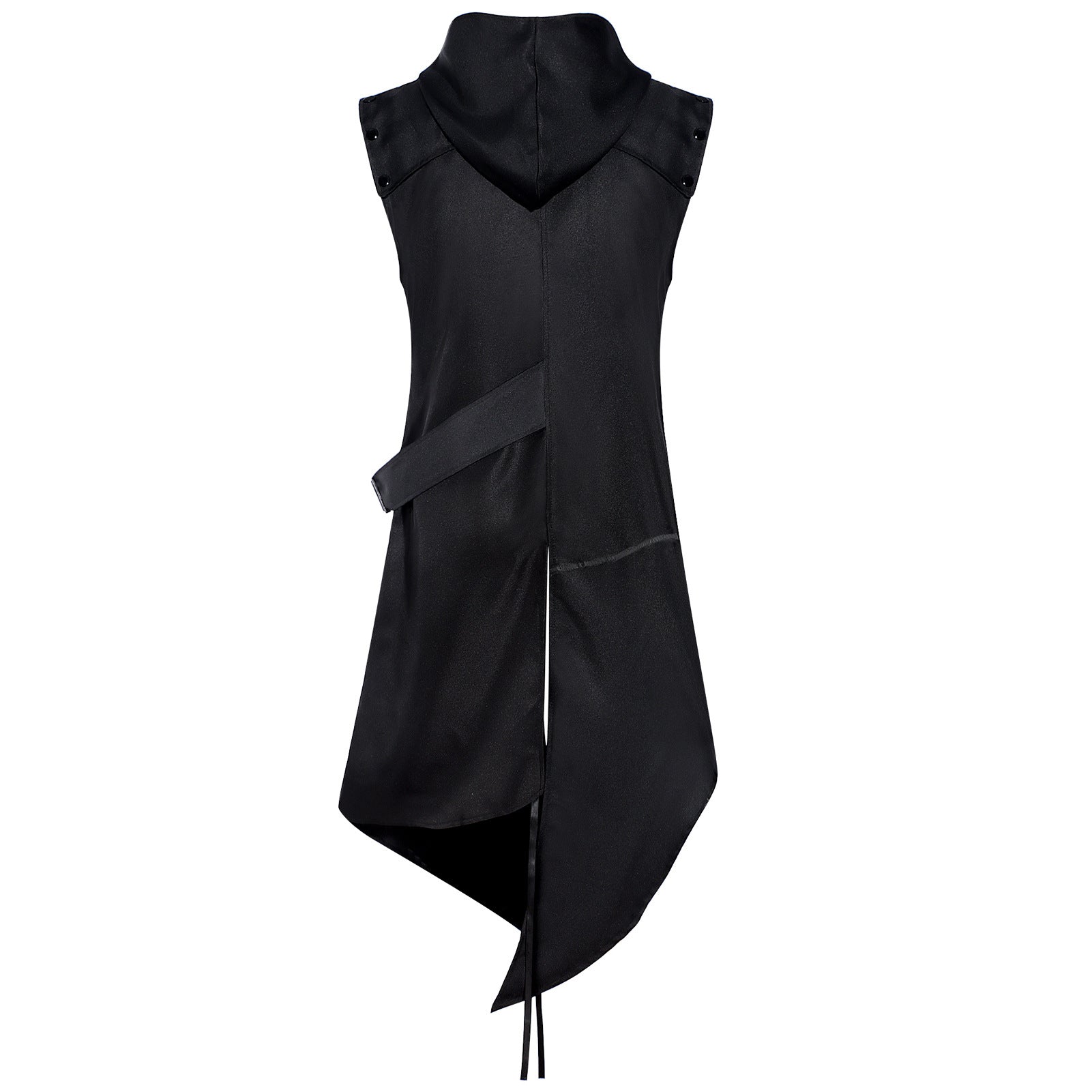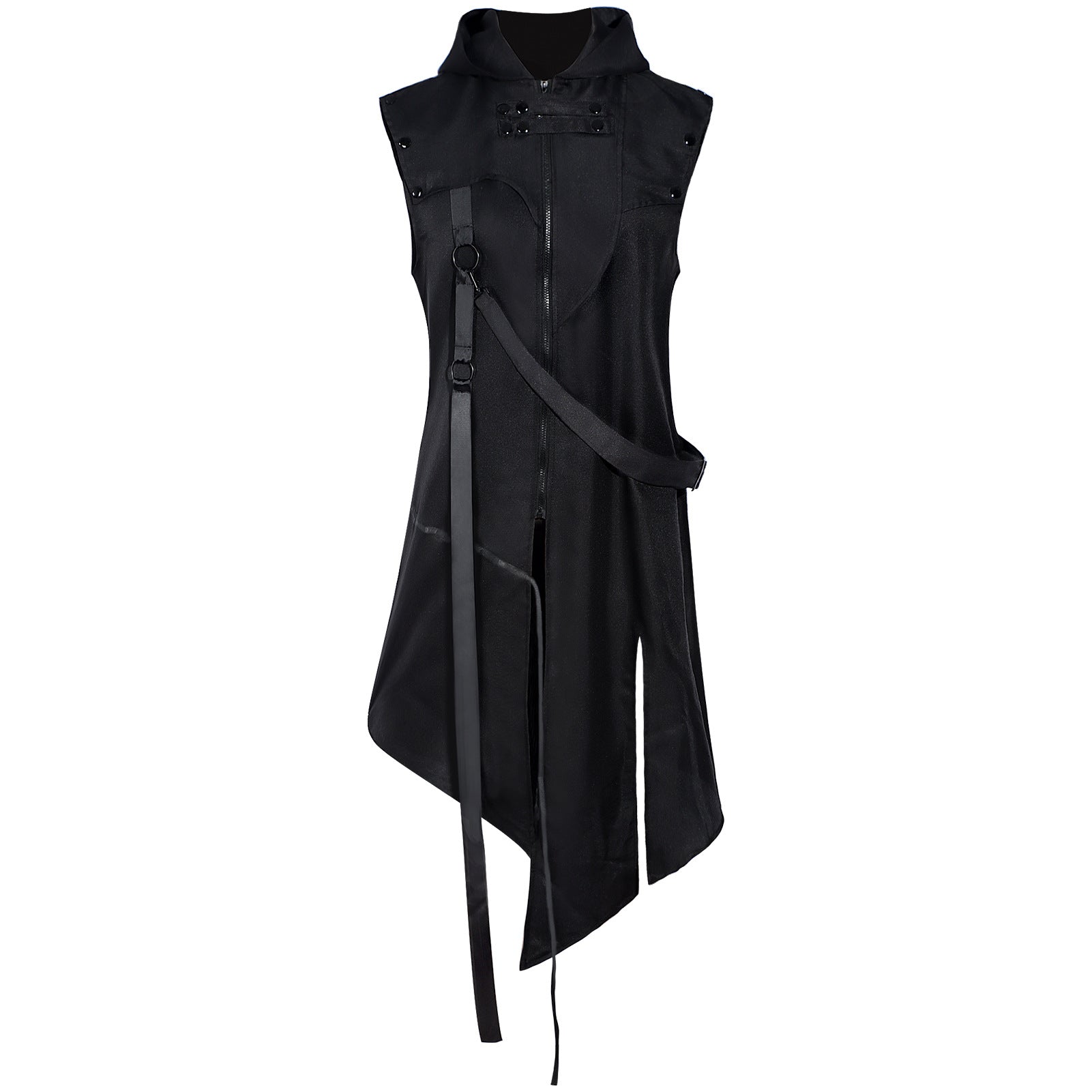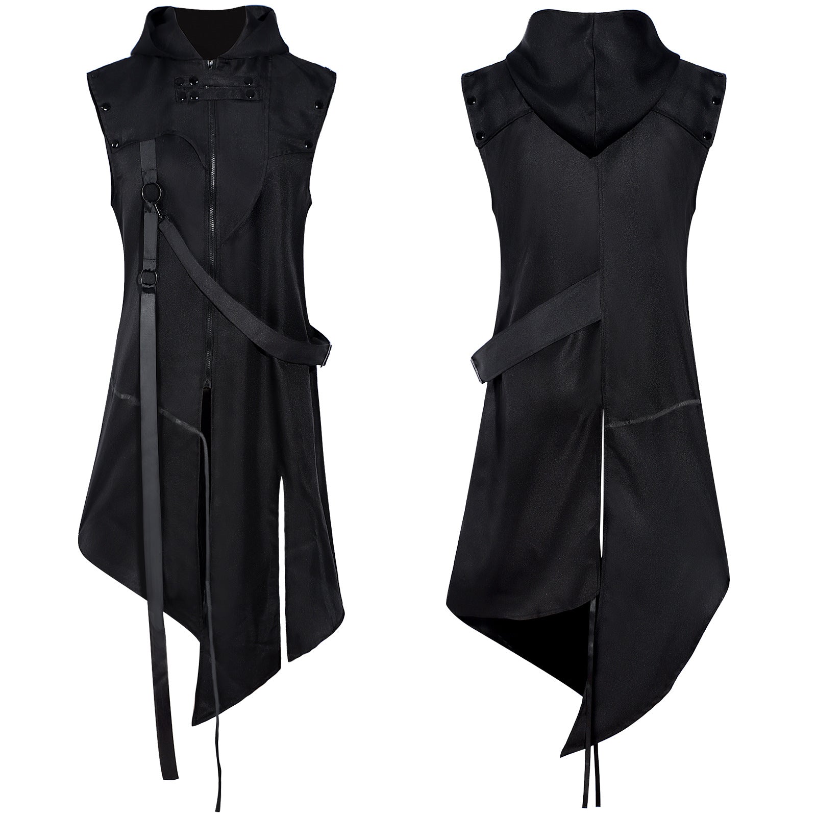 Elevate your cosplay or streetwear with this unisex Gothic hooded sleeveless coat. Blending punk, steampunk and medieval warrior aesthetics, it features an asymmetric hem, adjustable straps and a bold oversized hood—perfect for Halloween, LARP, festivals and stage shows.