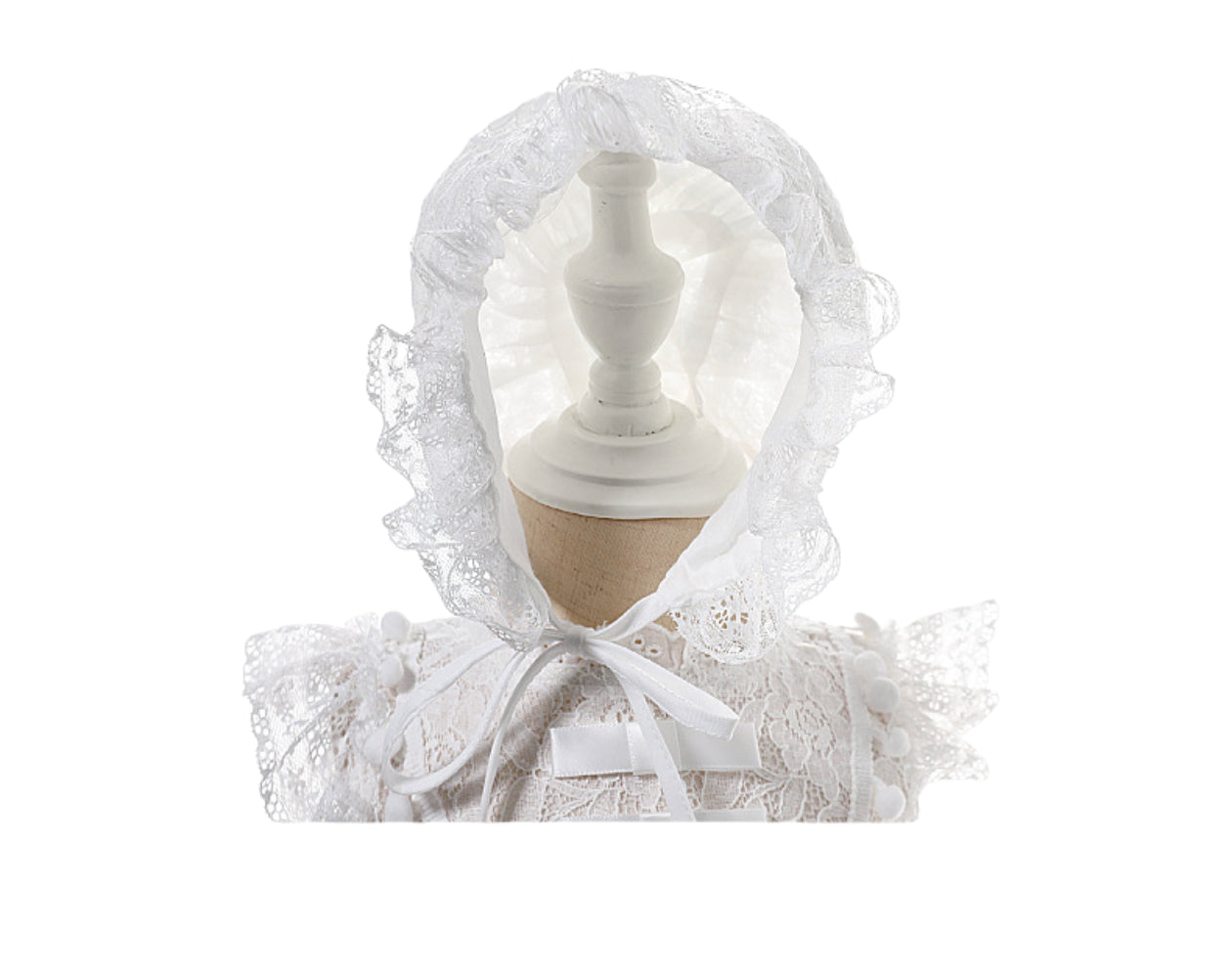 - Includes matching bonnet with lace and ruffle trim