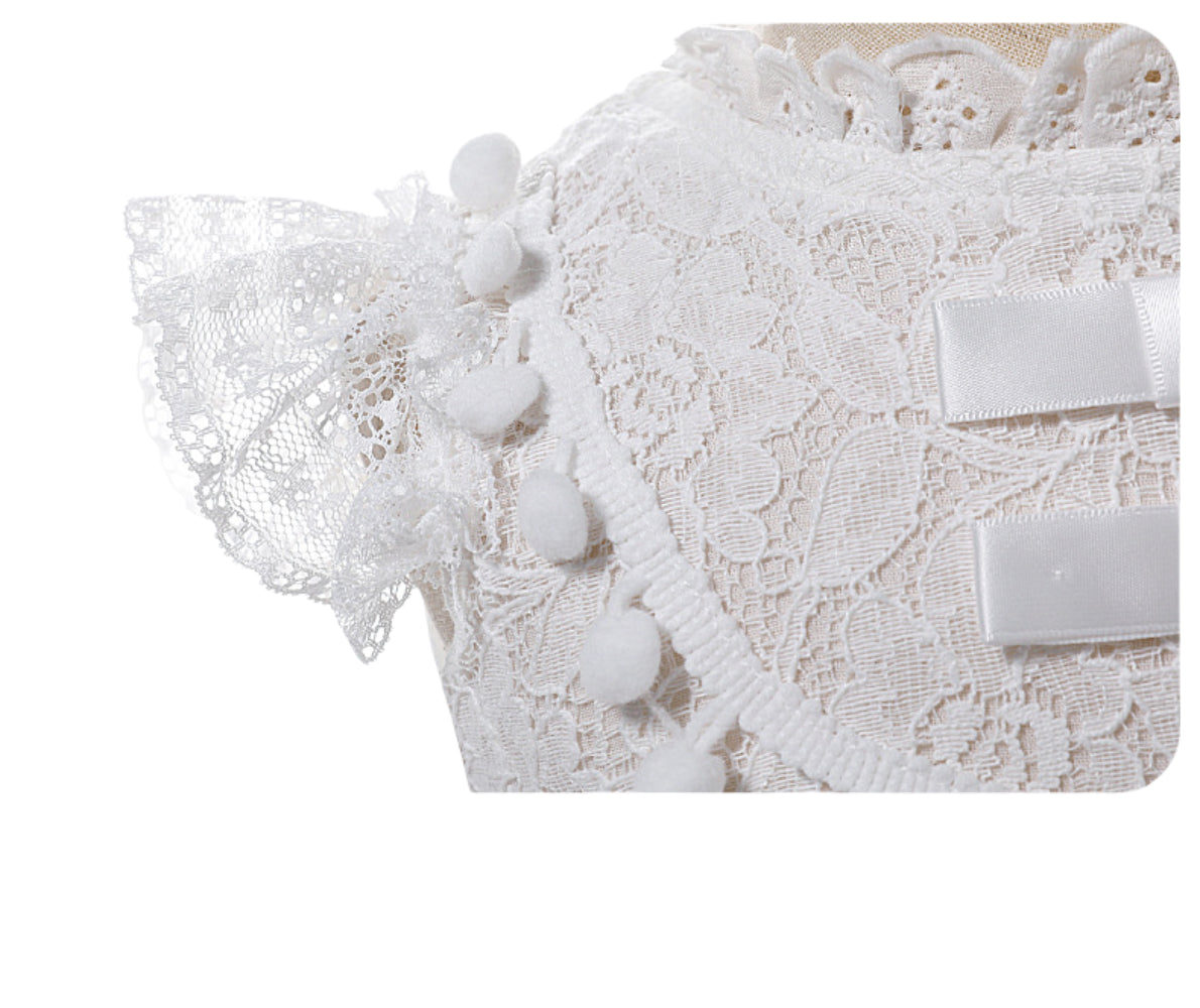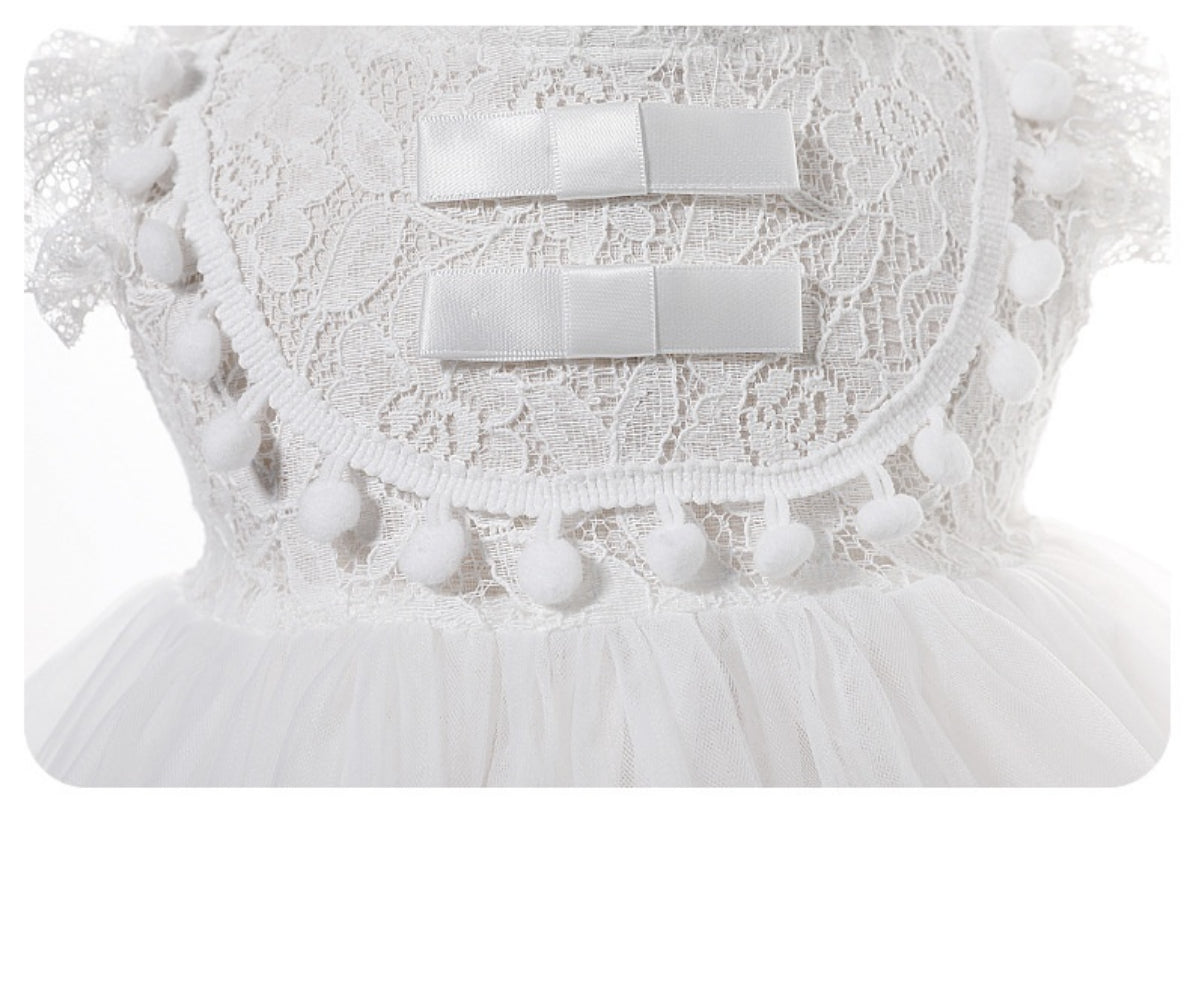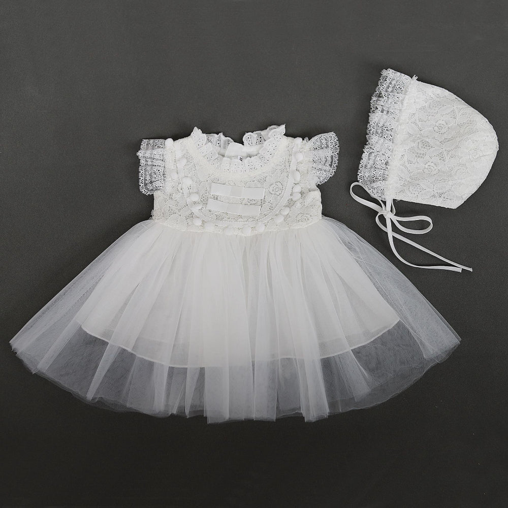 This charming white lace baby gown features a soft puffed tulle skirt and intricately crocheted lace bodice. The sleeveless design includes delicate pom-pom trim and satin bow details. Paired with a matching bonnet, it offers a truly angelic look for baby’s first special moments.